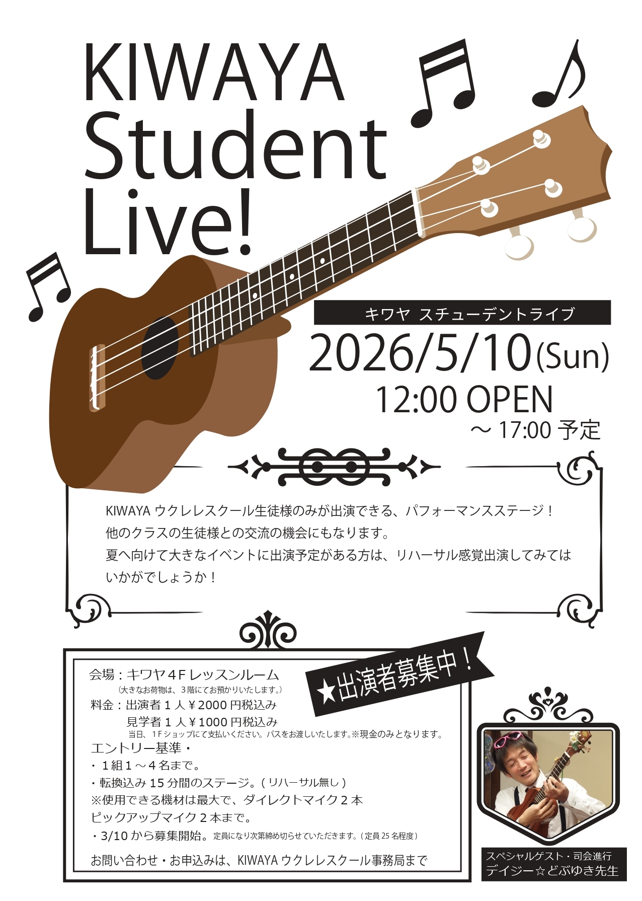 キワヤスクール生徒様のみの発表会『スチューデントライブ』を開催いたします!